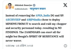 এক্স হ্যান্ডলে অভিষেক এই ঘটনায় কেন্দ্রকে আক্রমণ করে লিখেছেন, ‘‘এনআইএ-র ডিজি এবং এসপিকে সরানোর বদলে আজ নির্বাচন কমিশন এবং বিজেপি তাদের ধামাধারী আয়কর দফতরের আধিকারিকদের পাঠিয়েছিল আমার হেলিকপ্টারে তল্লাশি চালাতে। যদিও তাতে কোনও লাভ হয়নি। কারণ কিছুই পাওয়া যায়নি।’’